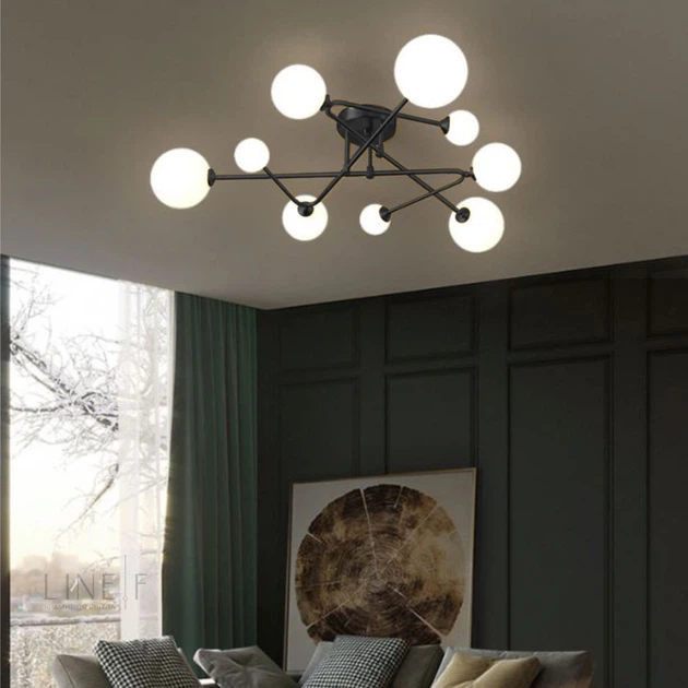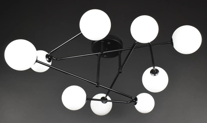 Стельова люстра в чорному корпусі з вигнутими ріжками на 9 ламп