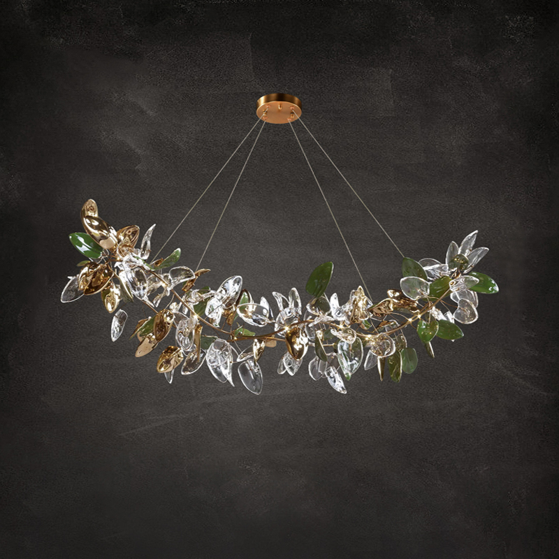 Підвісна люстра ELLING B L250 Green від бренду DEPRIMO створена у сучасному стилі із флористичними елементами. Люстра має ширину 2500 мм і висоту 650 мм, ідеально підходить для розміщення на стелі у вітальні, готелі, шоу-румі, студії чи холі. Арматура люстри виконана з високоякісного металу з латуньним оздобленням, створюючи елегантний і стильний зразковий вигляд. Плафони виготовлені із міцного