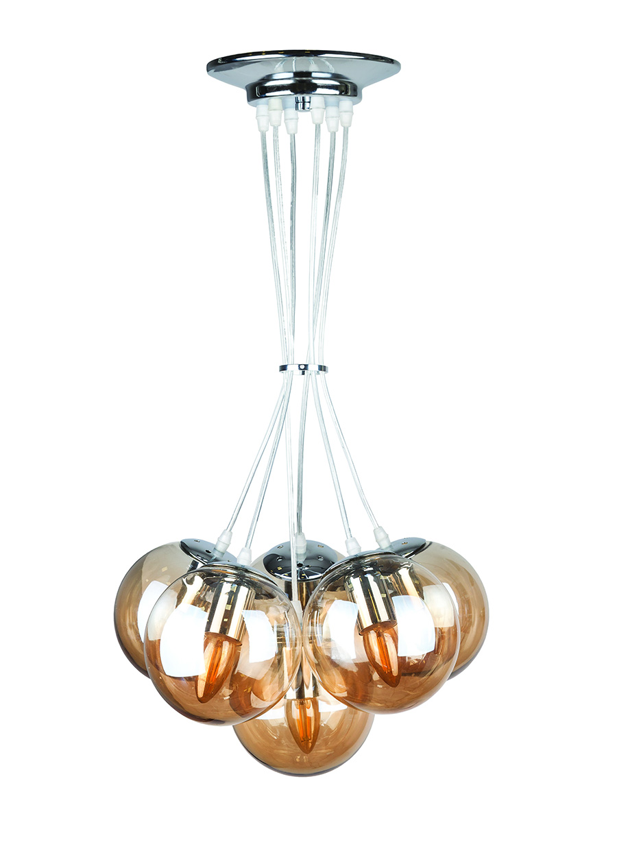 Підвіс в стилі модерн 756PR150F-6 CR+BR Матеріал люстри: метал+скло Колір люстри: хром+коричневий Кількість плафонів - 6 Розмір плафона - 150 мм Тип кріплення - стельовий коло 200 мм Кріплення до стелі колір - хром Матеріал кріплення - метал Джерело світла - 6 ламп Е27 Максимальна потужність лампочки 60 Ватт Можливість використання лампи: LED, розжарювання, енергозберігаюча Комплектація лампочками: Немає Тип люстри - підвісна
