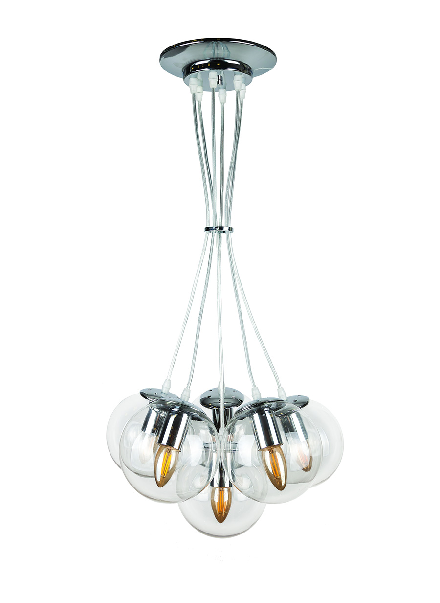 Підвіс в стилі модерн 756PR150F-6 CR+CL Матеріал люстри: метал+скло Колір люстри: хром+прозорий Кількість плафонів - 6 Розмір плафона - 150 мм Тип кріплення - стельовий коло 200 мм Кріплення до стелі колір - хром Матеріал кріплення - метал Джерело світла - 6 ламп Е27 Максимальна потужність лампочки 60 Ватт Можливість використання лампи: LED, розжарювання, енергозберігаюча Комплектація лампочками: Немає Тип люстри - підвісна