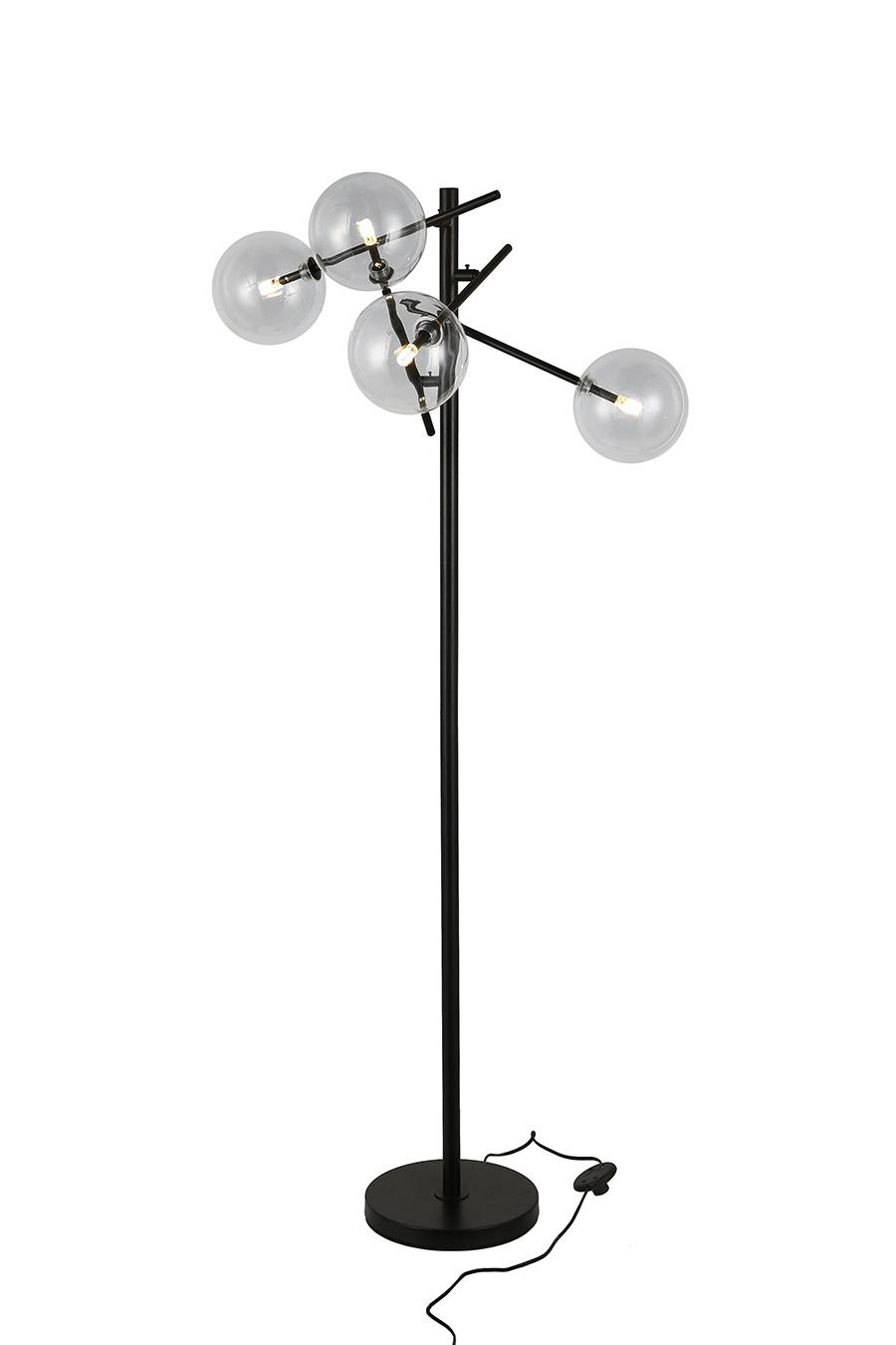 Матеріал - метал+склоКолір - чорнийМатеріал абажура - склоРозміри: 300x260x1650 ммТип: підлоговий світильникДжерело світла - 4 лапи G4Максимальна потужність - 40WКомплектація лампою - немаєДіаметр плафону 150 мм