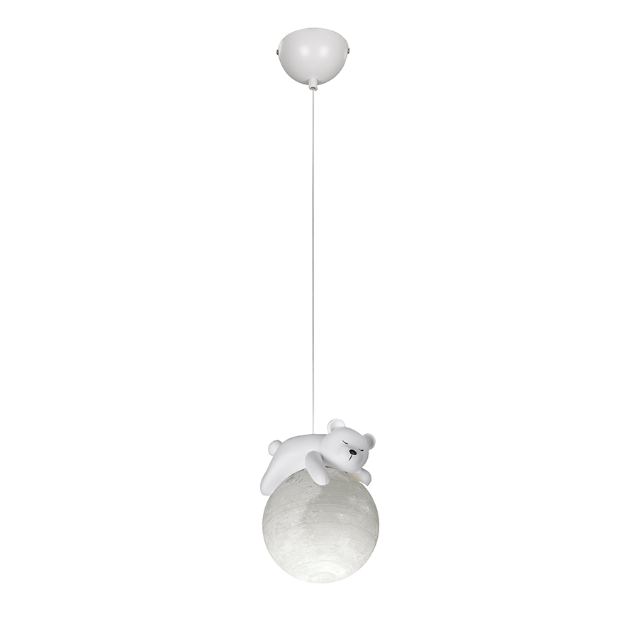 Підвісний світильник 782150-1 BR (Ведмедик) Кількість плафонів - 1 Плафон - 3D (пластик) Діаметр плафону - 150мм Матеріал фігурки - гіпс Колір - білий Стельова основа - півкуля 100мм Джерело світла - 1 лампа G9