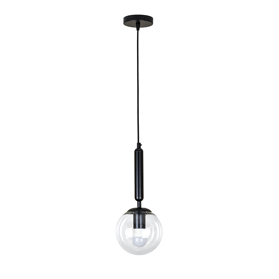 Підвіс в стилі модерн 9992015F-1 BK+CL Матеріал - метал/скло Висота (макс.) - 1100 мм Колір підвіса: чорний Колір плафона: прозорий Діаметр плафону - 150 мм Тип кріплення - стельове коло Діаметр кріплення - 100 мм Матеріал кріплення - метал Матеріал плафону - скло Колір кріплення - чорний Джерело світла - 1 Е27 лампа Максимальна потужність лампочки - 40 W