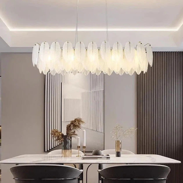 Підвісна овальна золота люстра з білим скляним пір'ям у корпусі 100х40 см | Line F | Арт. MJ370-L1000*350