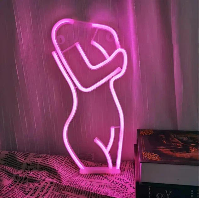 Портативний неоновий LED світильник жіноче тіло, лампа для декору кімнати працює від батарейок або USB, рожевий
