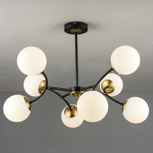 Стельова люстра Valeso B N6612/8 BK+COP зі скляними білими кулями на вісім ламп E27 чорний корпус з міддю