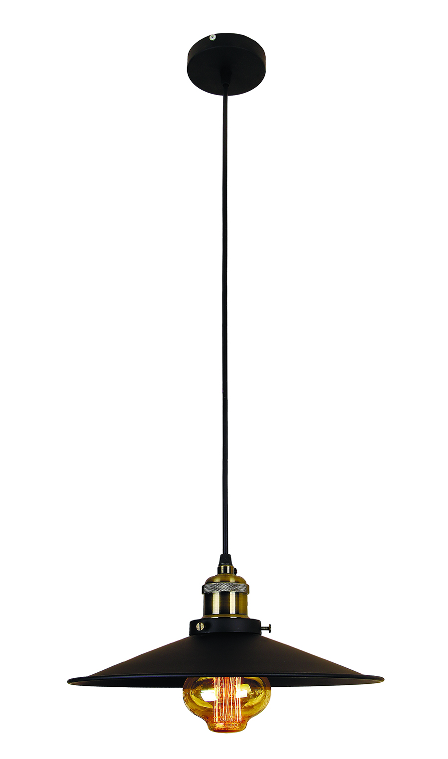 Підвіс в стиле лофт 7526858F3-1 BK Матеріал плафона: металКолір плафона - чорнийКількість плафонів - 1Ширина плафона - 290 ммВисота люстри від 300 до 1000 ммТип кріплення - стельовий колоКріплення до стелі (підстава) колір - чорнийМатеріал кріплення - металДжерело світла - 1 Е27 лампаПатрон - колір старе золото (gold old copper) Можливе виготовлення з іншим кольором патронаМаксимальна потужність лампочки 60 ВаттМожливість використання лампи: LED, розжарювання, енергозберігаючаКомп