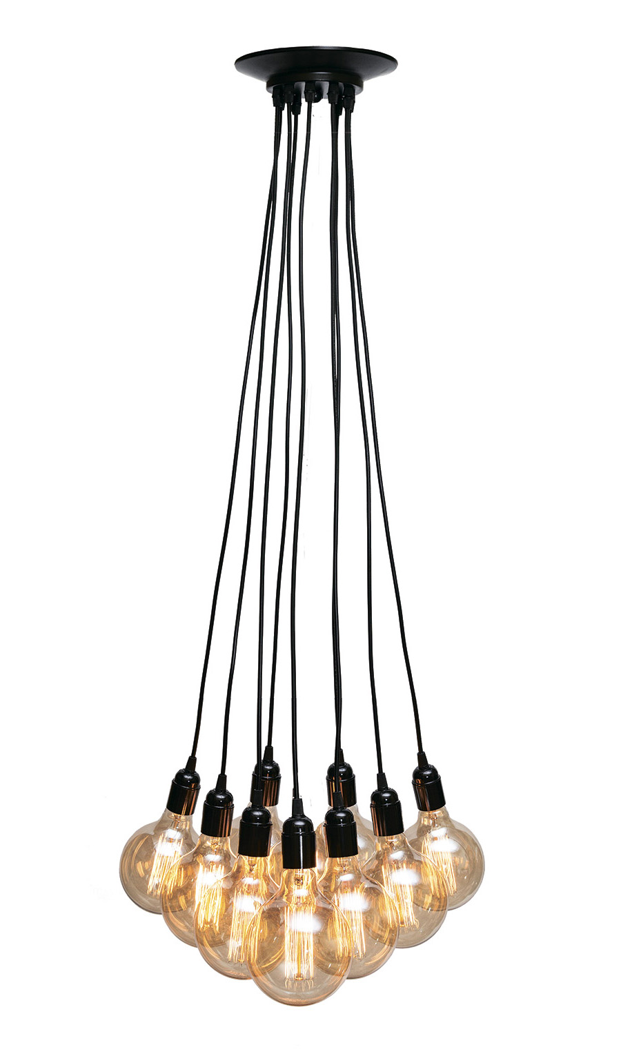 Висота люстри від 300 до 1000 мм Тип кріплення - стельове коло Кріплення до стелі колір - чорний Матеріал кріплення - метал Джерело світла - 9 лампочок Е27 Максимальна потужність лампочки 60 Ватт Можливість використання лампи: LED, розжарювання, енергозберігаюча Комплектація лампочками: Ні