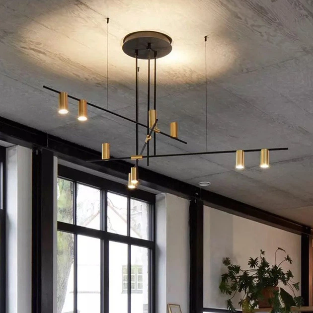 Лінійна підвісна люстра на 9 плафонів-спотів кольору латунь