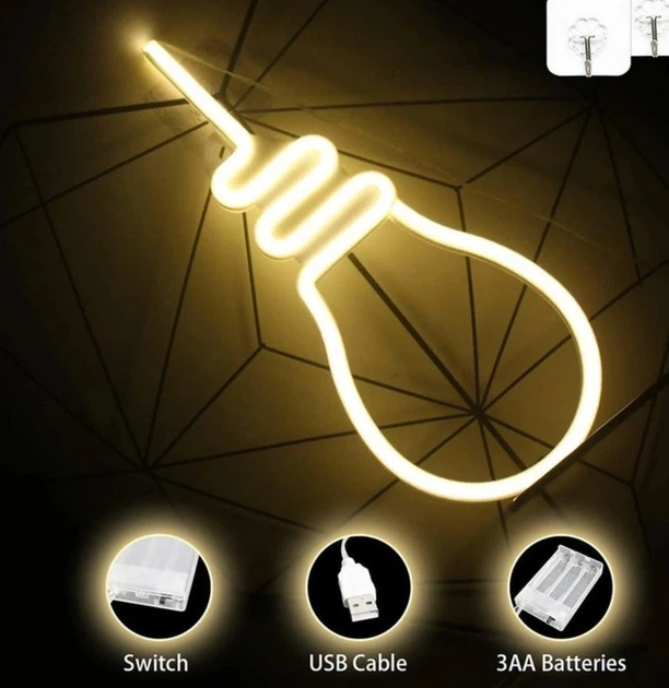 Настінний неоновий світильник нічник Лампочка Decoration Lamp (26х17 см, USB, 5 В, 3хАА, лампа) - Біла