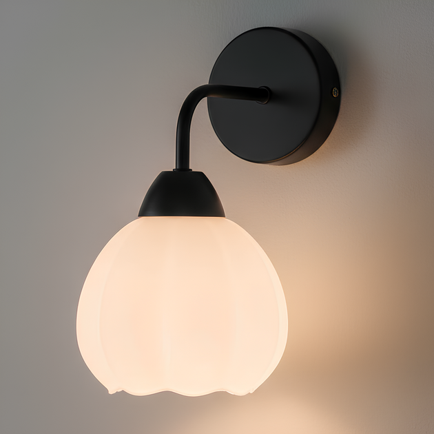 Настінний світильник Valeso BD665-1 BK з білим скляним плафоном у формі квітки під лампу Е27 на чорному каркасі