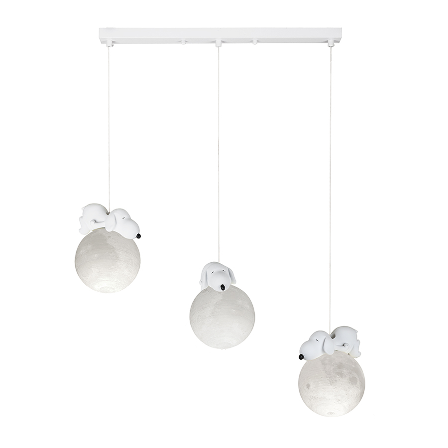 Підвісний світильник 782150-1 DG (Песик) Кількість плафонів - 3 Плафон - 3D (пластик) Діаметр плафону - 150мм Матеріал фігурки - гіпс Колір - білий Стельова основа - коло 300мм Джерело світла - 3 лампи G9