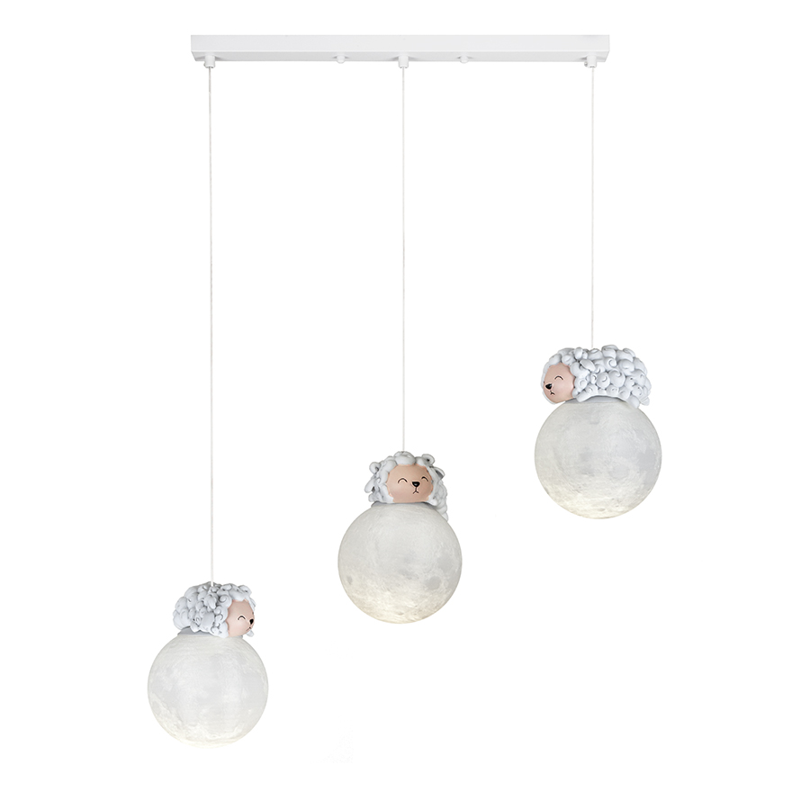 Підвісний світильник 782150-1 LB (Баранчик) Кількість плафонів - 3 Плафон - 3D (пластик) Діаметр плафону - 150мм Матеріал фігурки - гіпс Колір - білий Стельова основа - планка 500мм Джерело світла - 3 лампи E-27