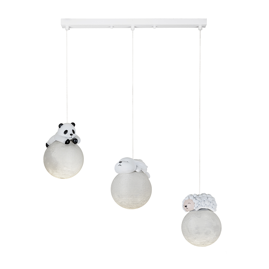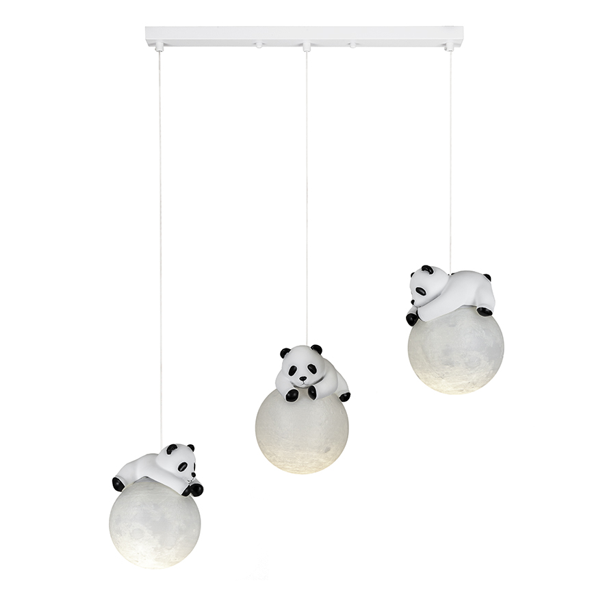 Підвісний світильник 782150-1 PA (Панда) Кількість плафонів - 3 Плафон - 3D (пластик) Діаметр плафону - 150мм Матеріал фігурки - гіпс Колір - білий Стельова основа - планка 500мм Джерело світла - 3 лампи E-27