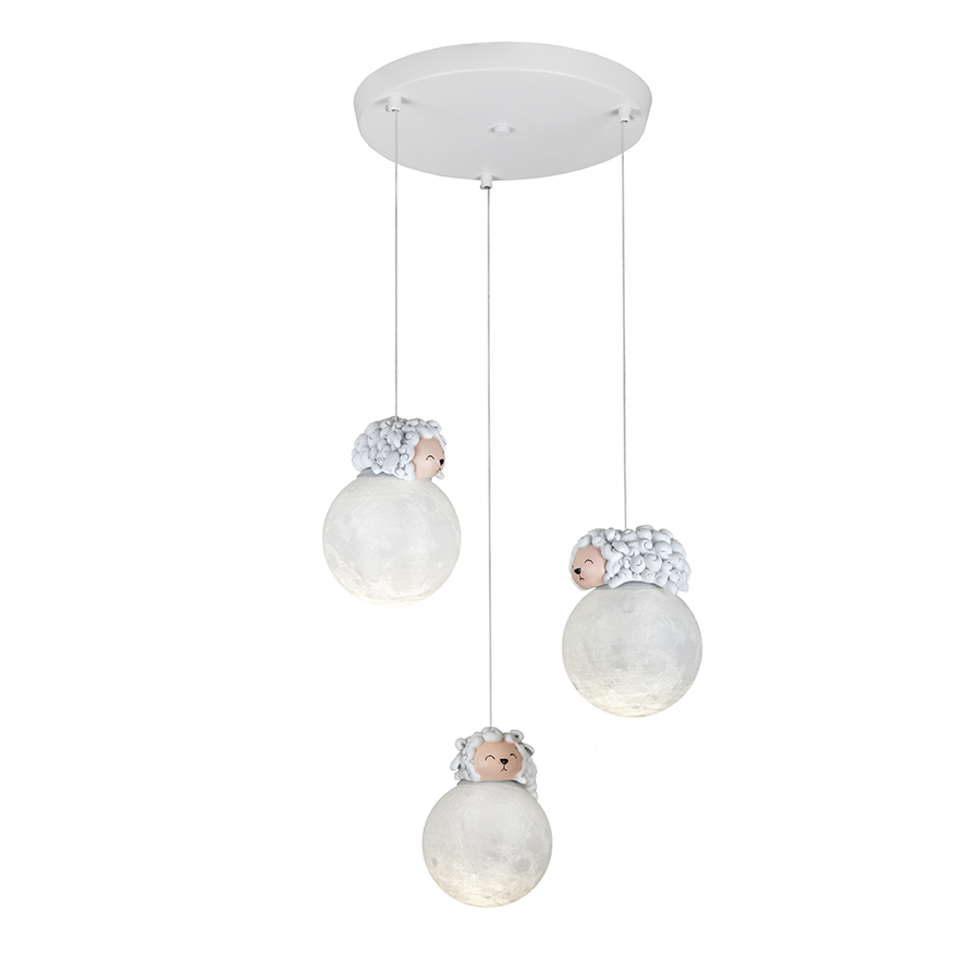 Підвісний світильник 782150-1 LB (Баранчик) Кількість плафонів - 3 Плафон - 3D (пластик) Діаметр плафону - 150мм Матеріал фігурки - гіпс Колір - білий Стельова основа - коло 300мм Джерело світла - 3 лампи E-27