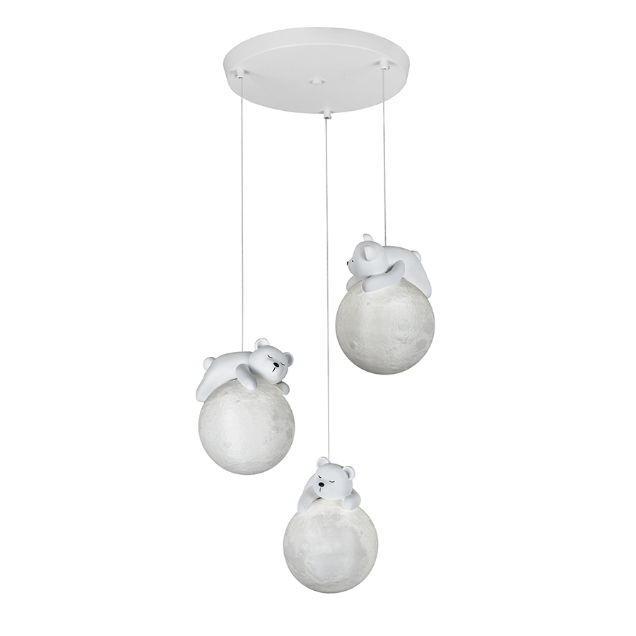 Підвісний світильник 782150-1 BR (Ведмедик) Кількість плафонів - 3 Плафон - 3D (пластик) Діаметр плафону - 150мм Матеріал фігурки - гіпс Колір - білий Стельова основа - коло 300мм Джерело світла - 3 лампи G9