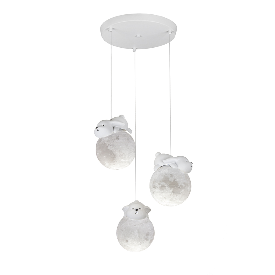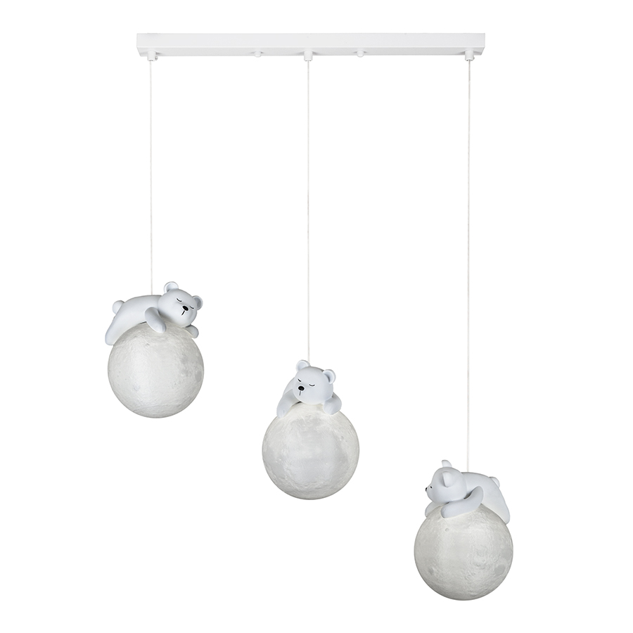 Підвісний світильник 782150-1 BR (Ведмедик) Кількість плафонів - 3 Плафон - 3D (пластик) Діаметр плафону - 150мм Матеріал фігурки - гіпс Колір - білий Стельова основа - планка 500мм Джерело світла - 3 лампи G9