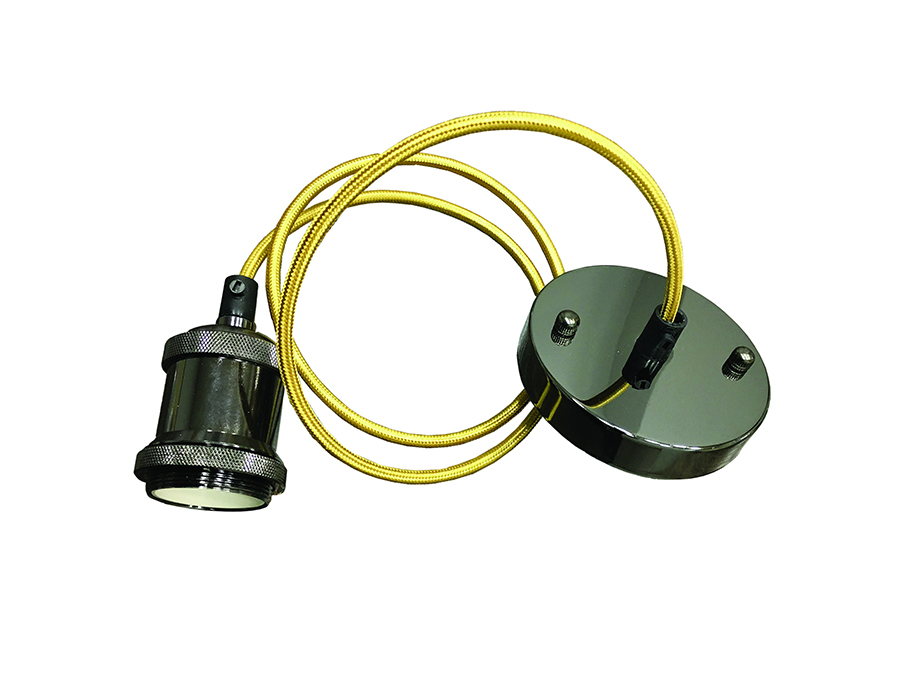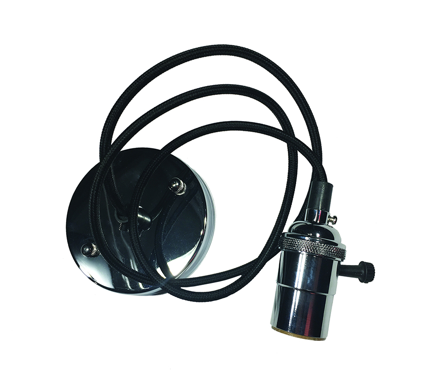 Підвіс з вимикачем ланцюжком на патроні Колір основи: хром глянцевий Колір дроту: чорний (можливий будь-який колір з нашої лінійки) Колір патрона: хром Матеріал: метал Розмір стельового кріплення: 100мм Довжина дроту: стандарт - 1 метр (можлива будь-яка довжина) Тип цоколя: Е27