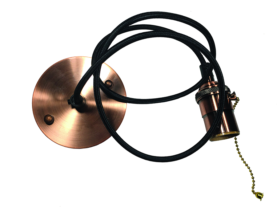 Підвіс з вимикачем ланцюжком на патроні Колір основи: червона мідь Колір дроту: чорний (можливий будь-який колір з нашої лінійки) Колір патрона: червона мідь Матеріал: метал Розмір стельового кріплення: 100мм Довжина дроту: стандарт - 1 метр (можлива будь-яка довжина) Тип цоколя: Е27