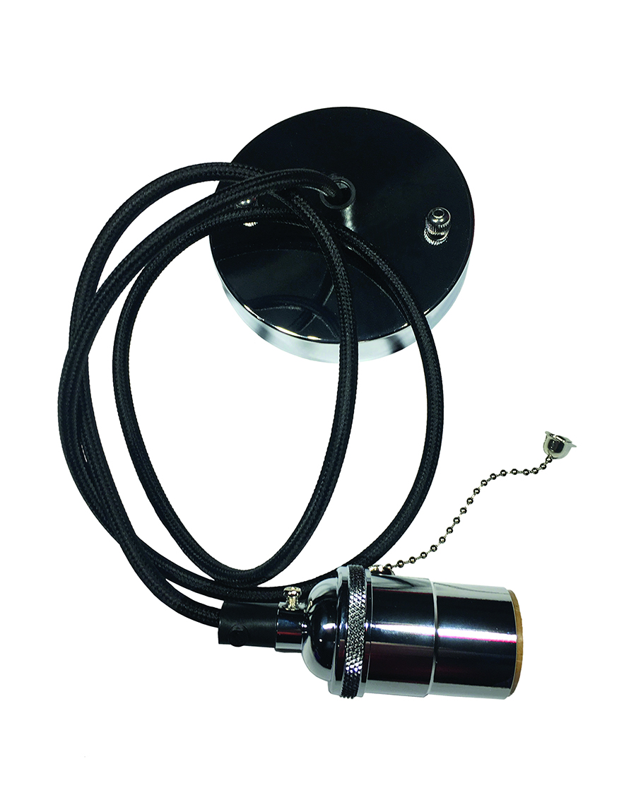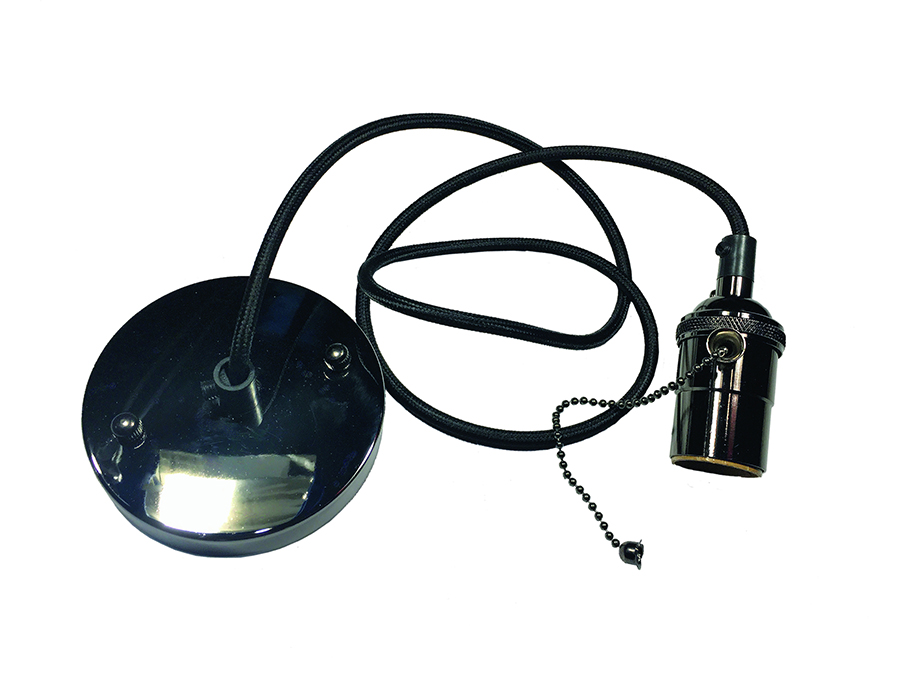 Підвіс з вимикачем ланцюжком на патроні Колір основи: чорний Колір дроту: чорний (можливий будь-який колір з нашої лінійки) Колір патрона: мідь Матеріал: метал Розмір стельового кріплення: 100мм Довжина дроту: стандарт - 1 метр (можлива будь-яка довжина) Тип цоколя: Е27