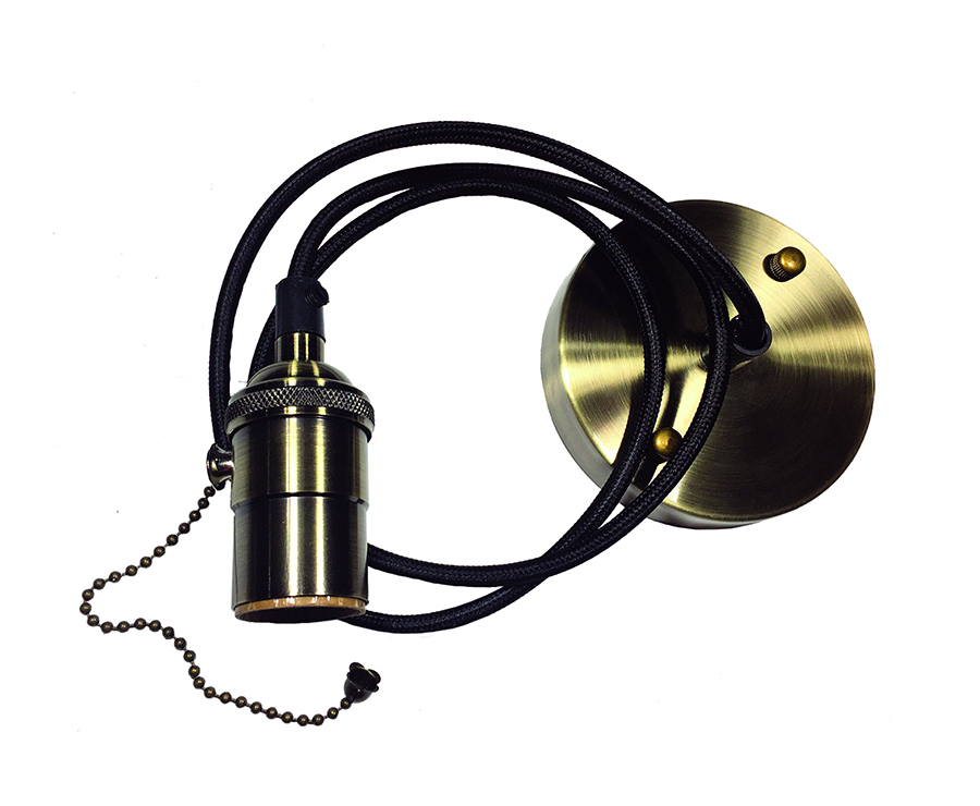Підвіс з вимикачем ланцюжком на патроні Колір основи: бронза Колір дроту: чорний (можливий будь-який колір з нашої лінійки) Колір патрона: бронза Матеріал: метал Розмір стельового кріплення: 100мм Довжина дроту: стандарт - 1 метр (можлива будь-яка довжина) Тип цоколя: Е27