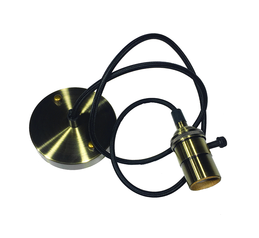 Підвіс із вимикачем на патроні Колір основи: бронза Колір дроту: чорний (можливий будь-який колір з нашої лінійки) Колір патрона: бронза Матеріал: метал Розмір стельового кріплення: 100мм Довжина дроту: стандарт - 1 метр (можлива будь-яка довжина) Тип цоколя: Е27