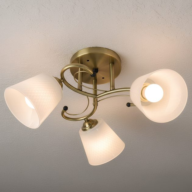 Класична люстра стельова VALESO 7051C/3 з трьома білими скляними плафонами під лампи E27 на бронзовому каркасі.