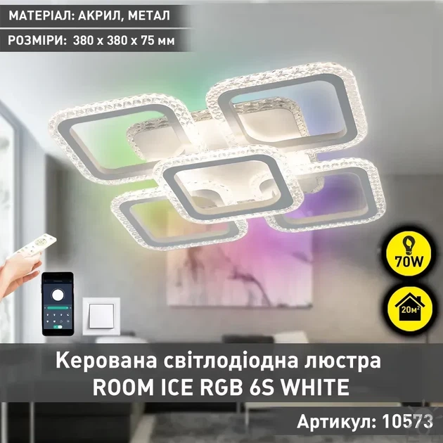 Смарт люстра керована світлодіодна ROOM ICE RGB 6S 70 Вт SMART 380x380x75 мм Бла ESLLSE