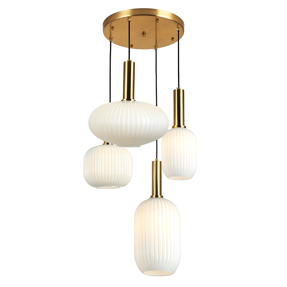 Стиль виконання: Модерн; Кількість джерел світла: 4; Матеріал плафона: Скло; Матеріал каркаса: Метал; Розмір плафонів: 140х365 мм 200х350 мм 200х490 мм 300х330 мм Тип цоколя: Е27; Потужність лампи: 40W; Колір плафона: білий; Колір арматури (підстави): Бронза;