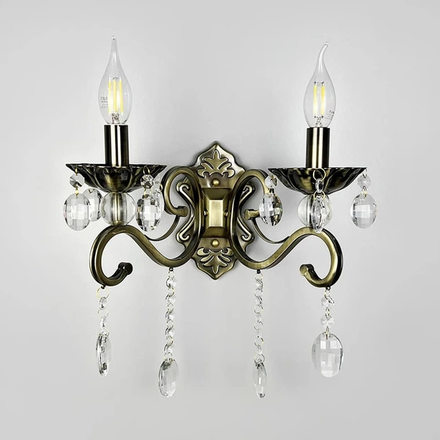 Бра підсвічник на 2 лампи із кришталевими підвісками у бронзовому корпусі