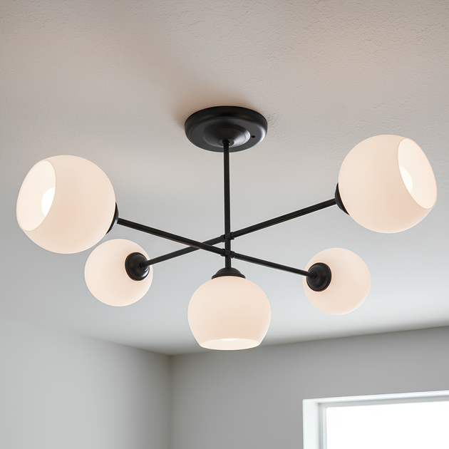 Стельова люстра VALESO 91175B/5 із п'ятьма білими скляними плафонами під лампи Е27 на чорному каркасі