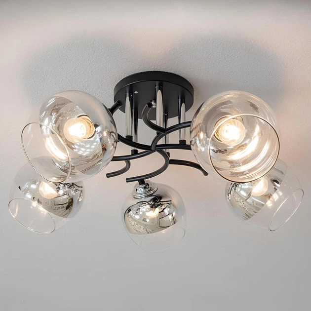 Стельова люстра Valeso Ю 6978A/5 BK+CR на п'ять прозоро-хромових скляних плафонів під лампи E27 чорно-хромовий корпус