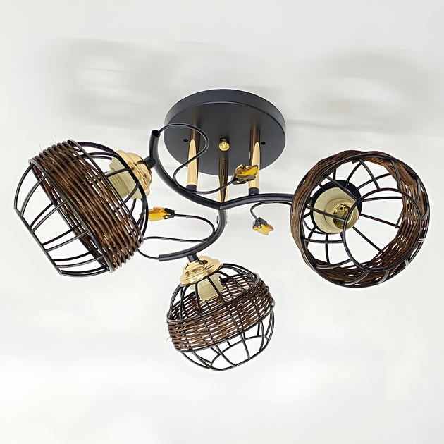 Люстра стельова VALESO 91188A/3 з трьома металевими плафонами та ротангові плетінням під лампи E27 чорно-золотий корпус