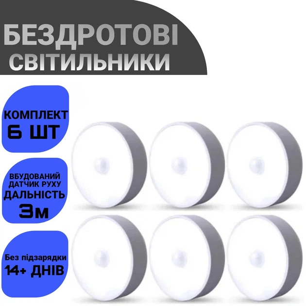 Світильник бездротовий з датчиком руху нічник акумуляторний холодний білий комплект 6 штук
