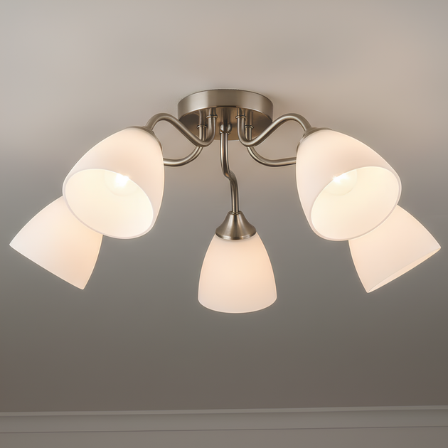 Стельова люстра Valeso N6631/5 з п'ятьма білими скляними плафонами під лампи E27 нікелевий корпус