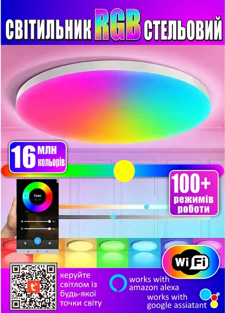 Люстра стельова світлодіодна розумна RGB з пультом ДК Smart LED Wi-Fi, керування голосом Alexa / Google, Tuya віддалений дос