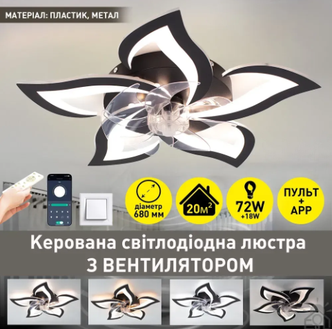 Люстра з вентилятором керована світлодіодна FAN ELLA 72 Вт + 18 Вт 680x120 мм Чорна