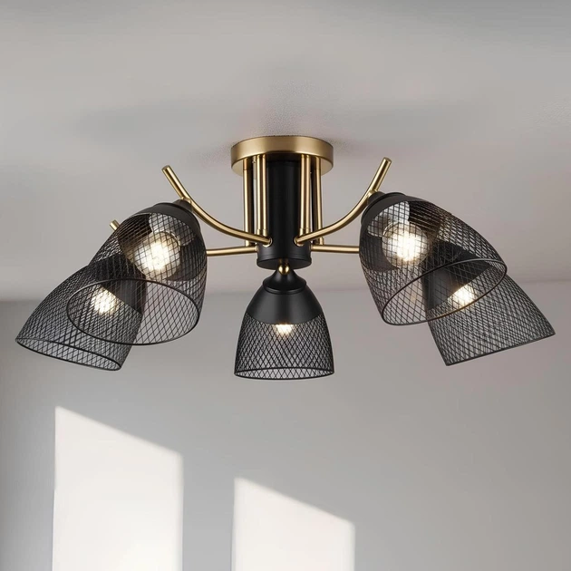 Стельова люстра Valeso B K2264/5 BK+COP з п'ятьма сітчастими плафонами під лампи Е27 корпус чорно-мідний