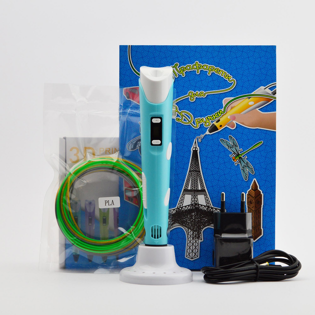 3D-ручка (Блакитна): Еко-Старт, 3 кольори PLA-пластику (15 м, по 5 м на кожен колір) + трафарети, підставка