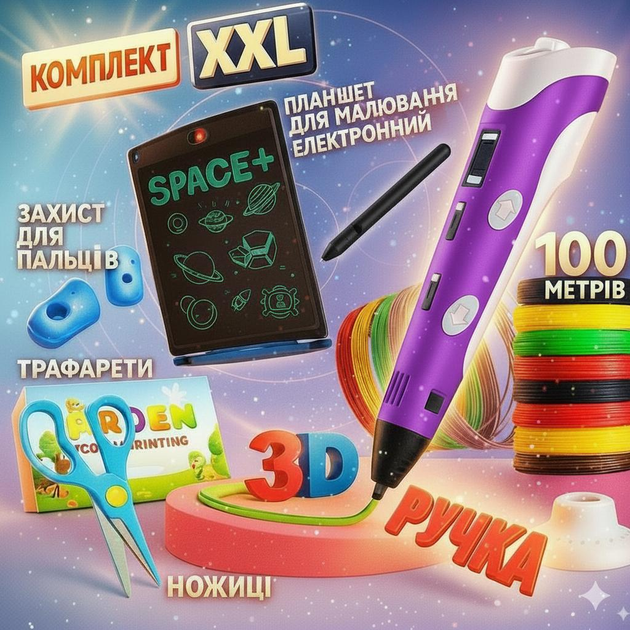 Набір дитяча ручка 3D Pen-6 з графічним планшетом для малювання + 100 метрів пластику, Violet