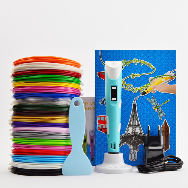 3D-ручка (Блакитна): Еко-Креатив, 20 кольорів PLA-пластику (100 м, по 5 м на кожен колір) + трафарети, лопатка, підставка