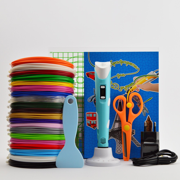 3D-ручка (Блакитна): Еко-Майстер, 20 кольорів PLA-пластику (100 м, по 5 м на кожен колір) + трафарети, килимок, ножиці, лопа