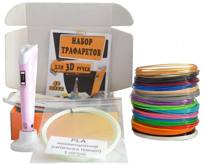 3D ручка рожева 3D Pen 2 з комплектом ПЛА Екопластика 20 кольорів 100 метрів та набором трафаретів