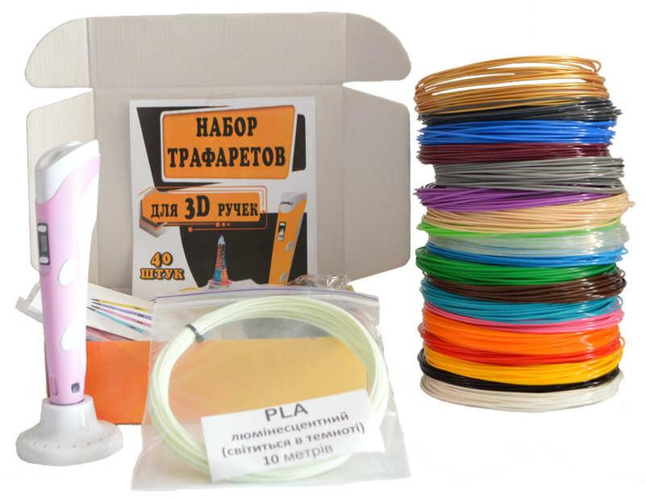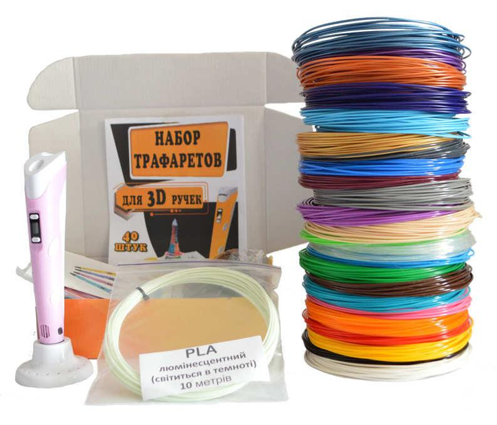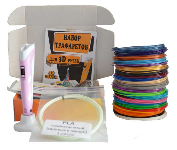 3D ручка рожева 3D Pen 2 з комплектом ПЛА Екопластика 25 кольорів 125 метрів та набором трафаретів
