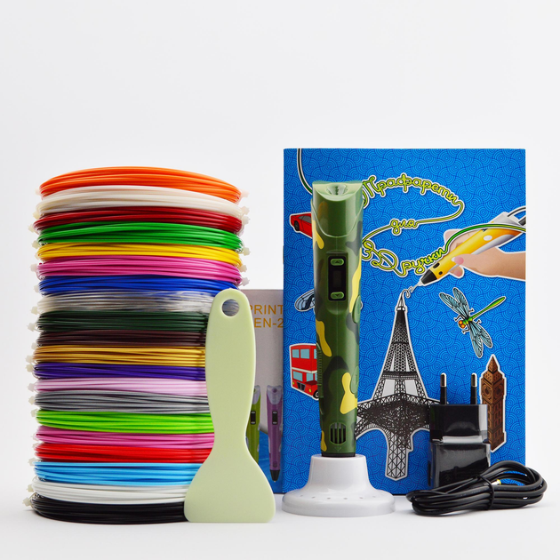 3D-ручка (Камуфляжна): Еко-Креатив, 20 кольорів PLA-пластику (100 м, по 5 м на кожен колір) + трафарети, лопатка, підставка