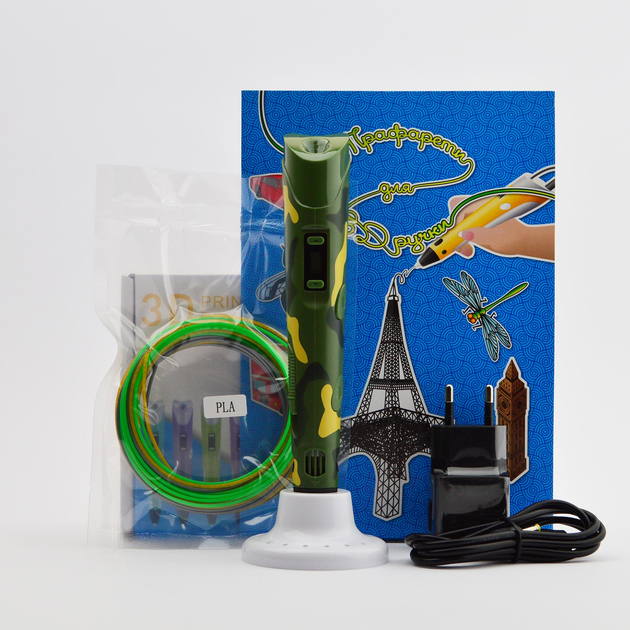 3D-ручка (Камуфляжна): Еко-Старт, 3 кольори PLA-пластику (15 м, по 5 м на кожен колір) + трафарети, підставка