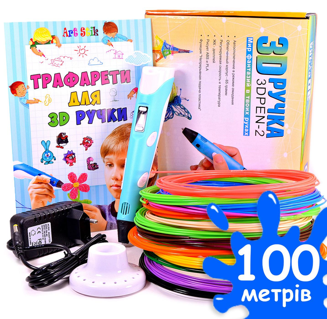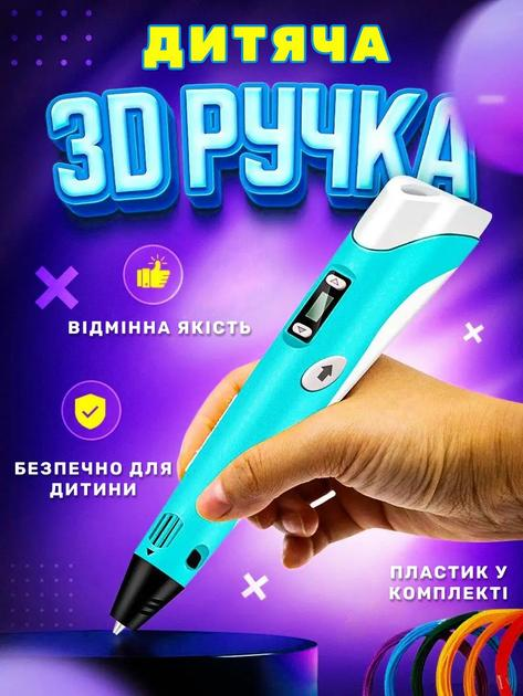 3D-ручка 3D Pen Блакитна з Набором Еко Пластика PLA (100 метрів) 12 різних кольорів та Трафаретами