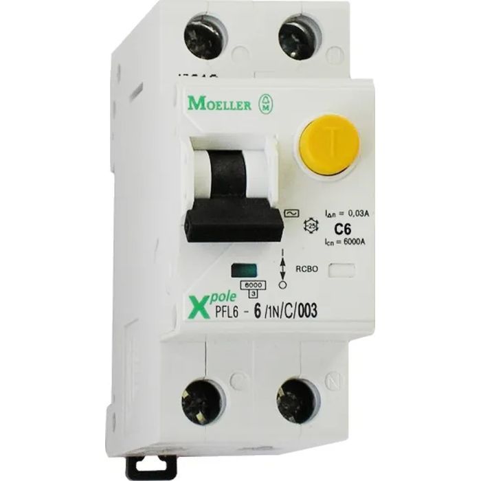 Серія - PFL6, Тип механізму - електромеханічний, Кількість полюсів - 2P (1P+N), Номінальний струм - 10А, Струм витоку - 30мА, Характеристика розчеплення - C, Номінальна відключаюча здатність - 6 kA