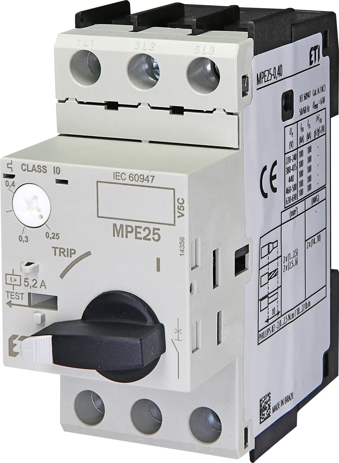 Автоматичний вимикач захисту двигуна MPE25-0,40 від ETI забезпечує надійний захист електродвигунів малої потужності від перевантажень, коротких замикань і обриву фази відповідно до стандартів IEC/EN 60947-4-1. З регульованим тепловим розчеплювачем у діапазоні 0,25–0,4 А пристрій ідеально підходить для двигунів номінальною потужністю до 0,09 кВт (при 230/400 В AC), включаючи мотори класу