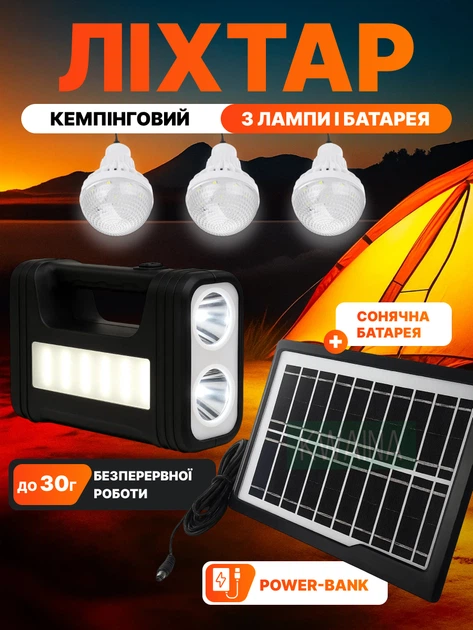 Система освітлення: зарядний пристрій та освітлювальна станція на сонячній батареї з функцією Power Bank + 3 лампочки з воло